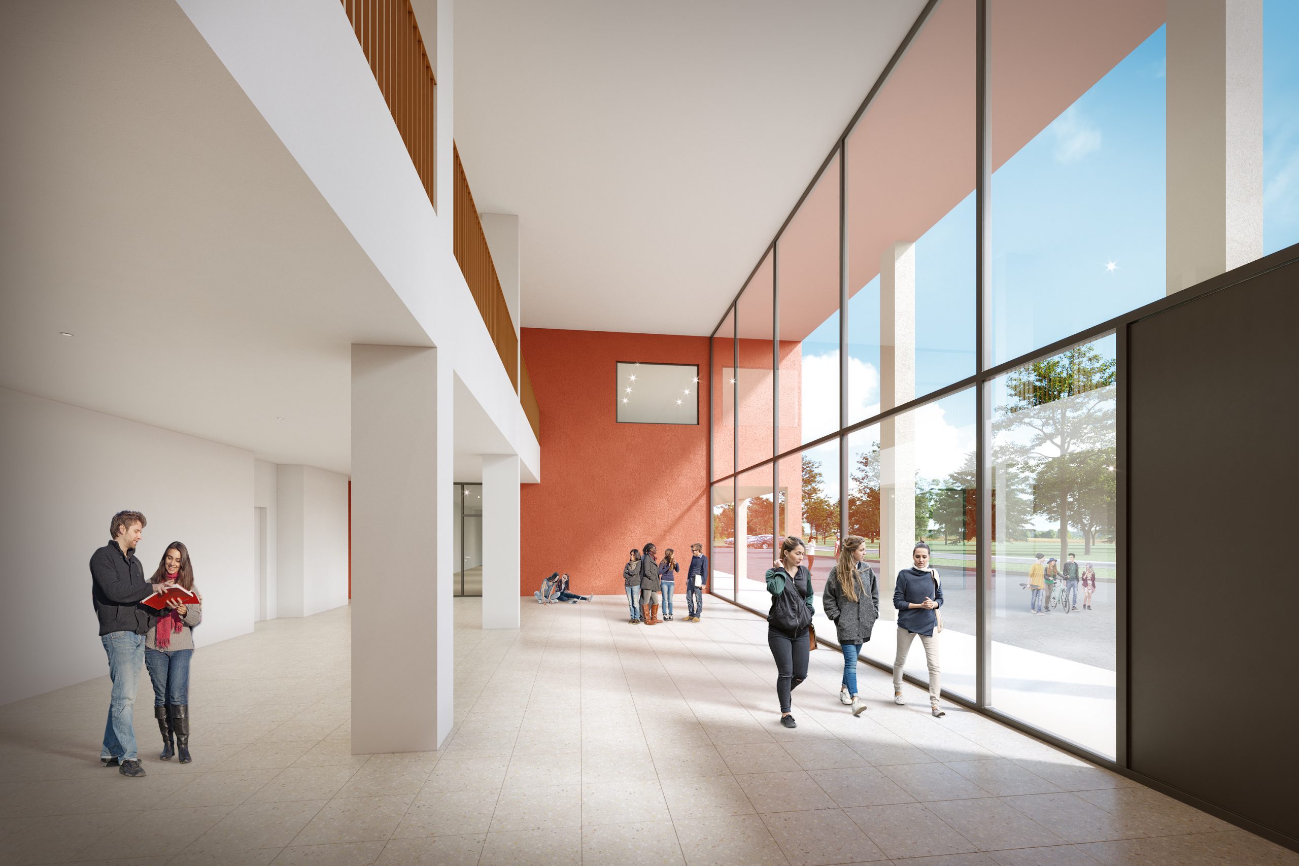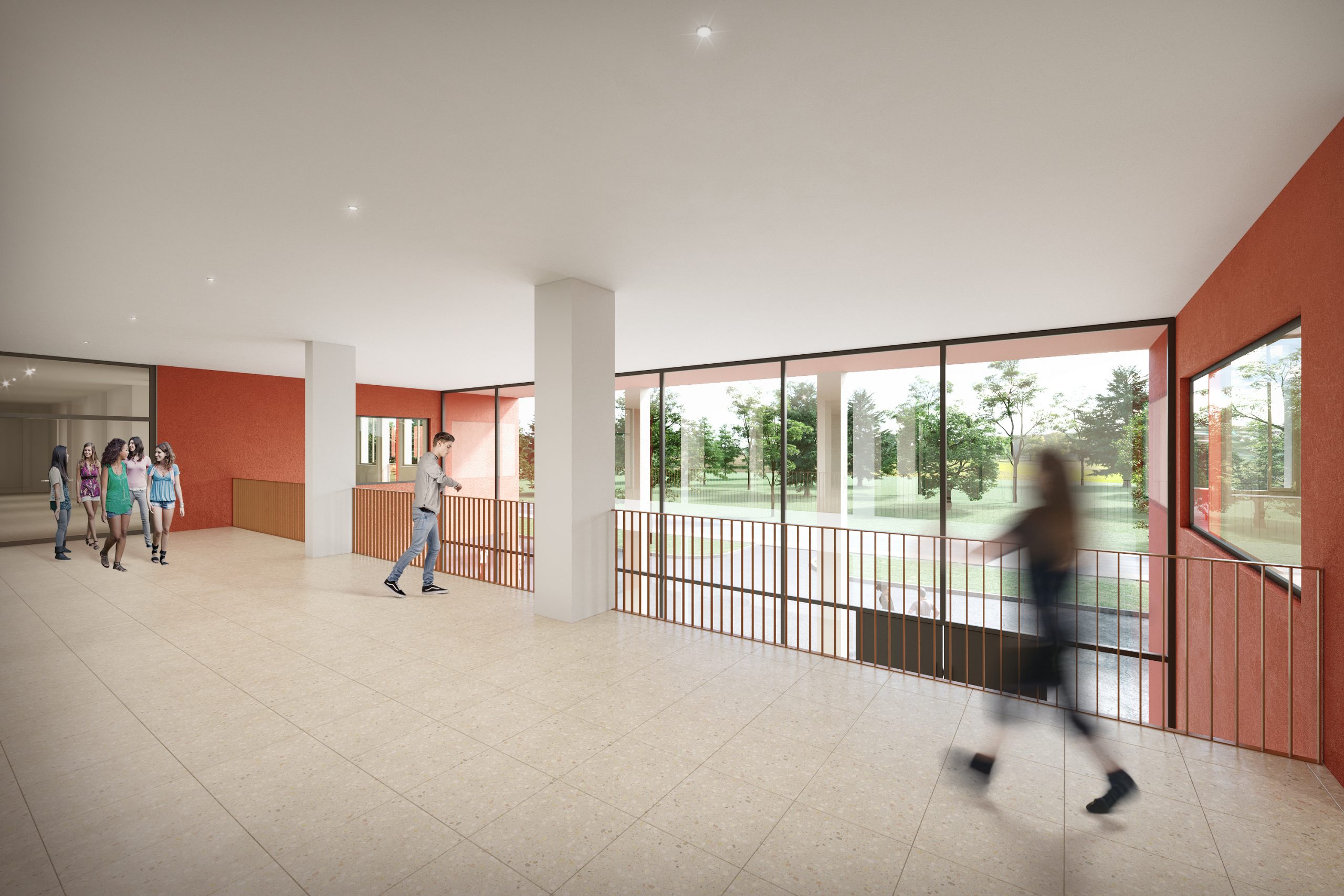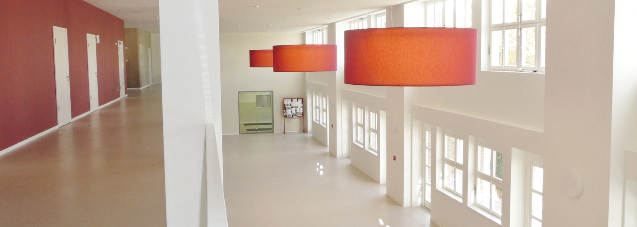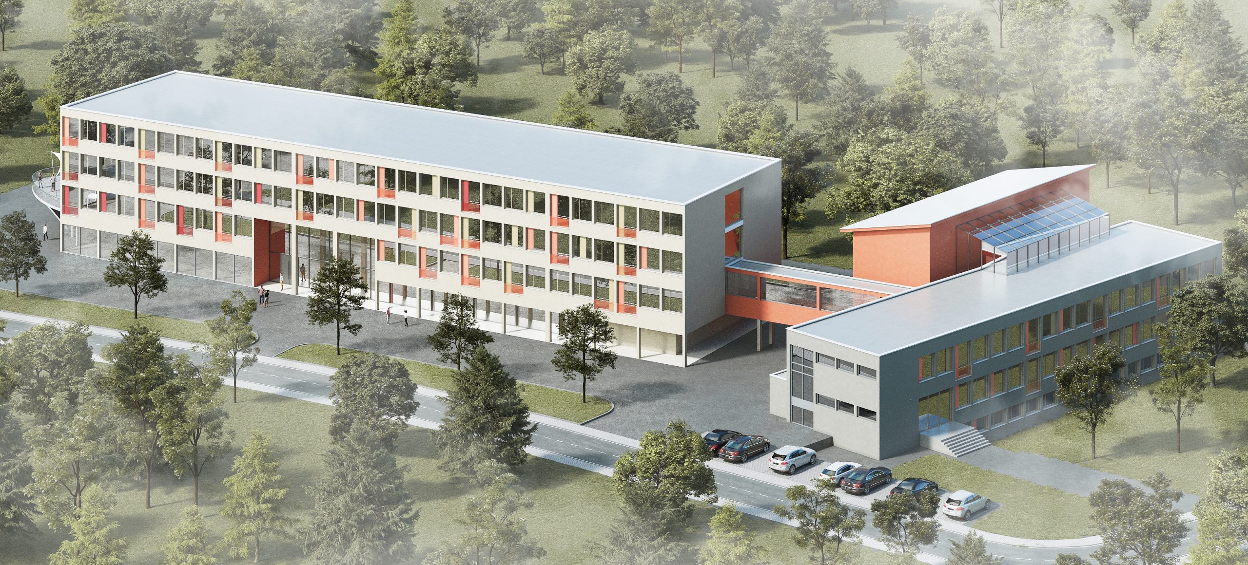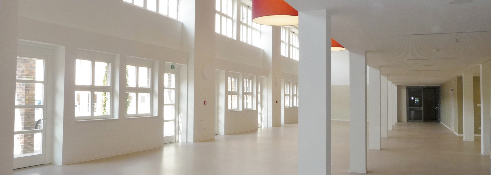 Eine Generalsanierung des denkmalgeschützten Schulgebäudes mit Sporthalle, Mensa, Außenanlagen, bietet neue Großzügigkeit in geschütztem Bestand.